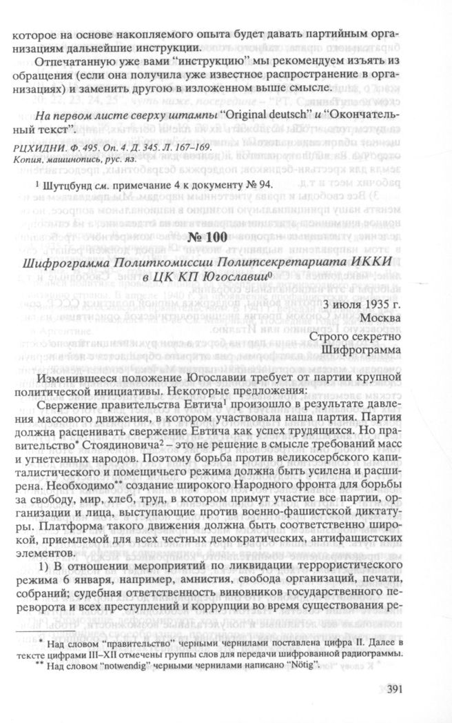 Шифрограмма Политкомиссии Политсекретариата ИККИ в ЦК КП Югославии. 3 июля 1935 г. Москва // РЦХИДНИ. Ф. 495. Оп. 184. Исх. за 1935 г. Д. 8. Л. 27-28. Подлинник, машинопись, нем. яз.