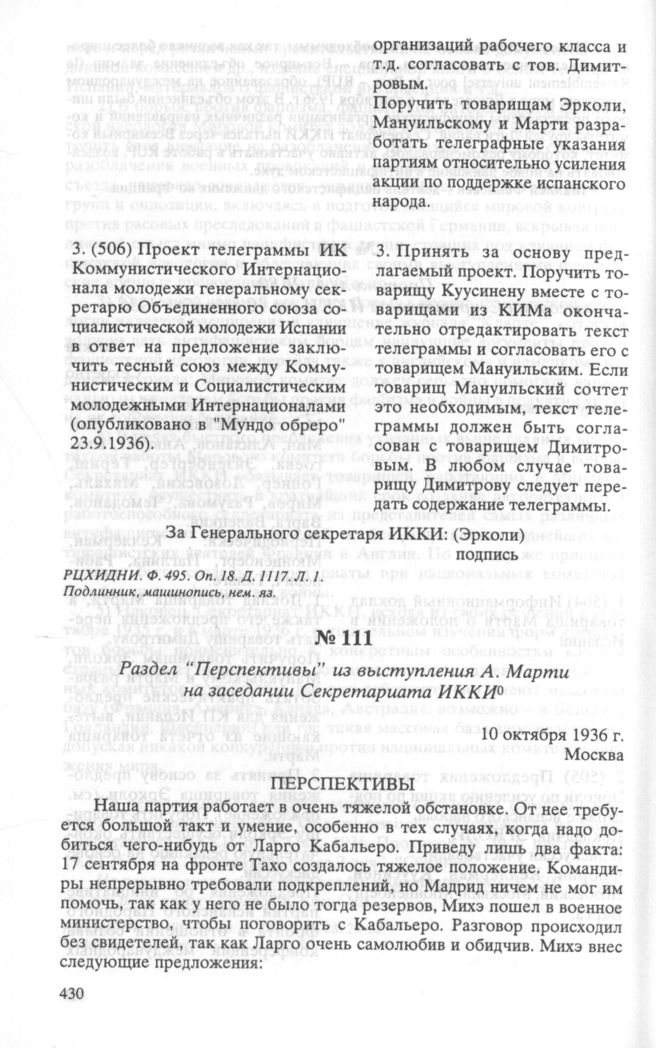 Раздел "Перспективы" из выступления А. Марти на заседании Секретариата ИККИ. 10 октября 1936 г. Москва