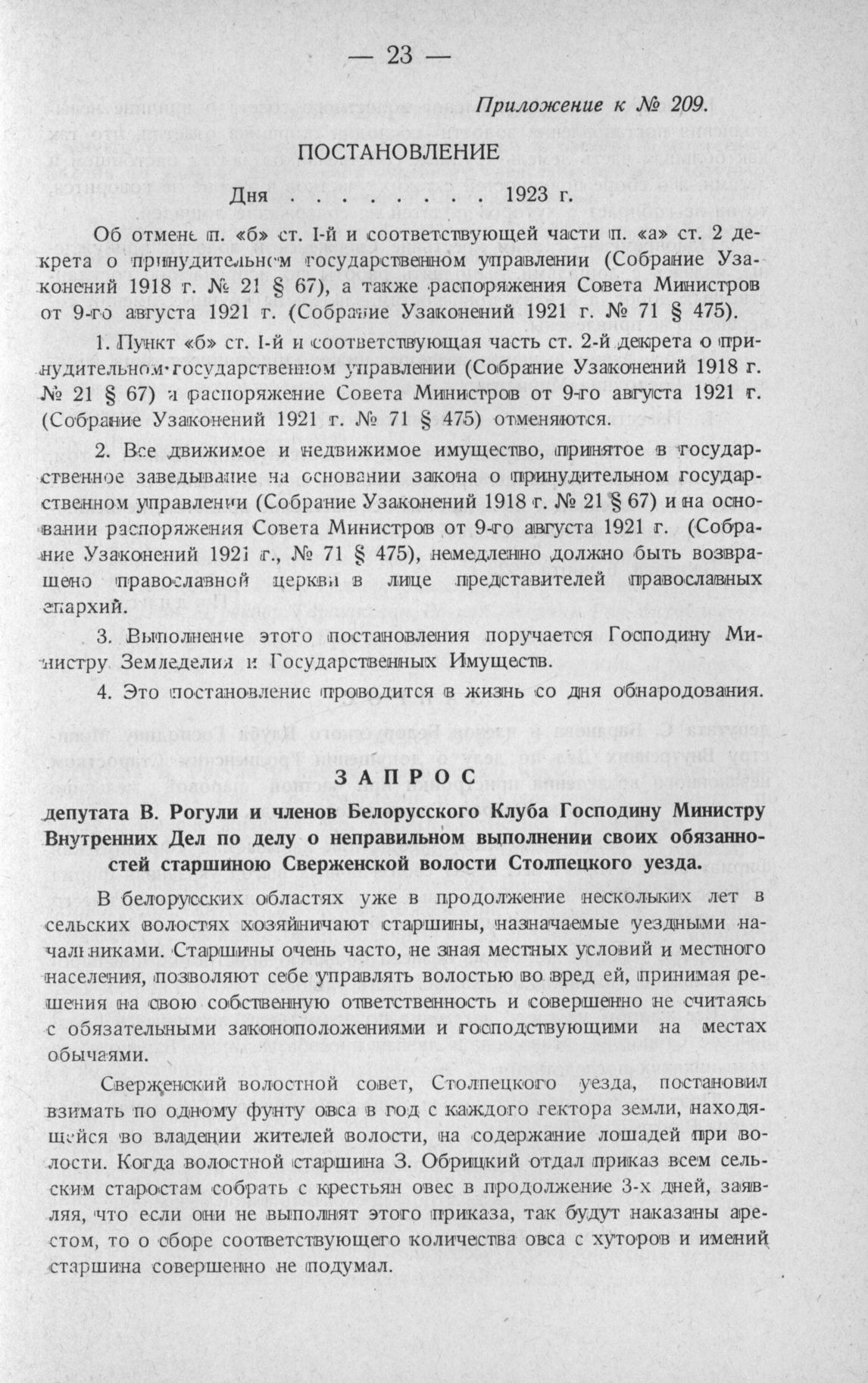 Запрос депутата В. Рогули и членов Белорусского Клуба Господину Министру Внутренних Дел по делу о неправильном выполнении своих обязанностей старшиною Сверженской волости Столпецкого уезда. Варшава, 6 марта 1923 г.