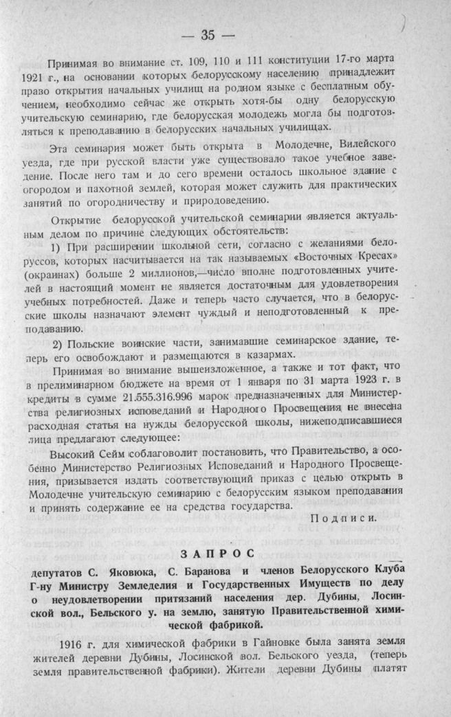 Запрос депутатов С. Яковюка, С. Баранова и членов Белорусского Клуба Г-ну Министру Земледелия и Государственных Имуществ по делу о неудовлетворении притязаний населения дер. Дубины, Лосинской вол., Бельского у. на землю, занятую Правительственной химической фабрикой. Варшава, 17 апреля 1923 г.