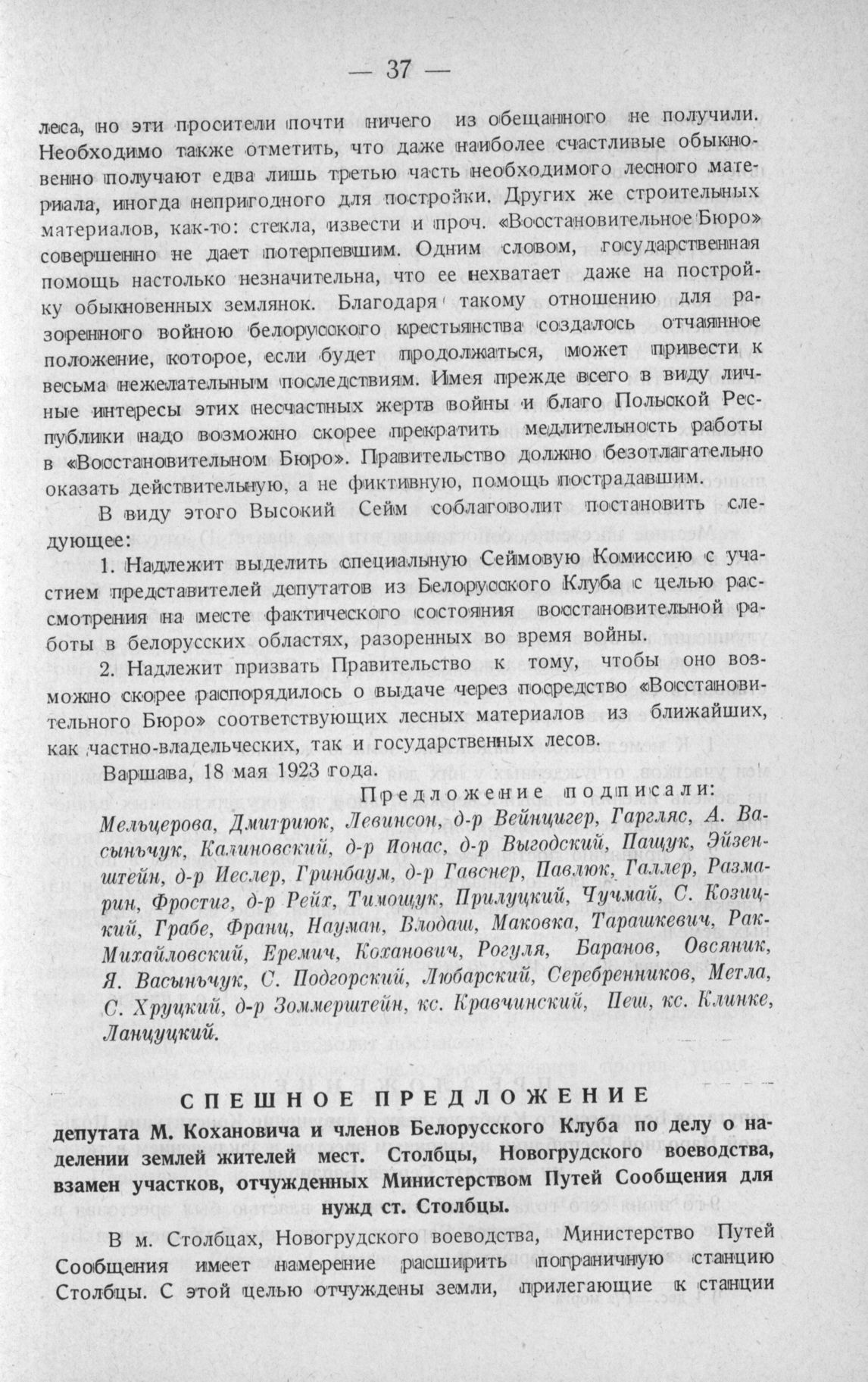 Спешное предложение депутата М. Кохановича и членов Белорусского Клуба по делу о наделении землей жителей мест. Столбцы, Новогрудского воеводства, взамен участков, отчужденных Министерством Путей Сообщения для нужд ст. Столбцы. Варшава, 30 мая 1923 года
