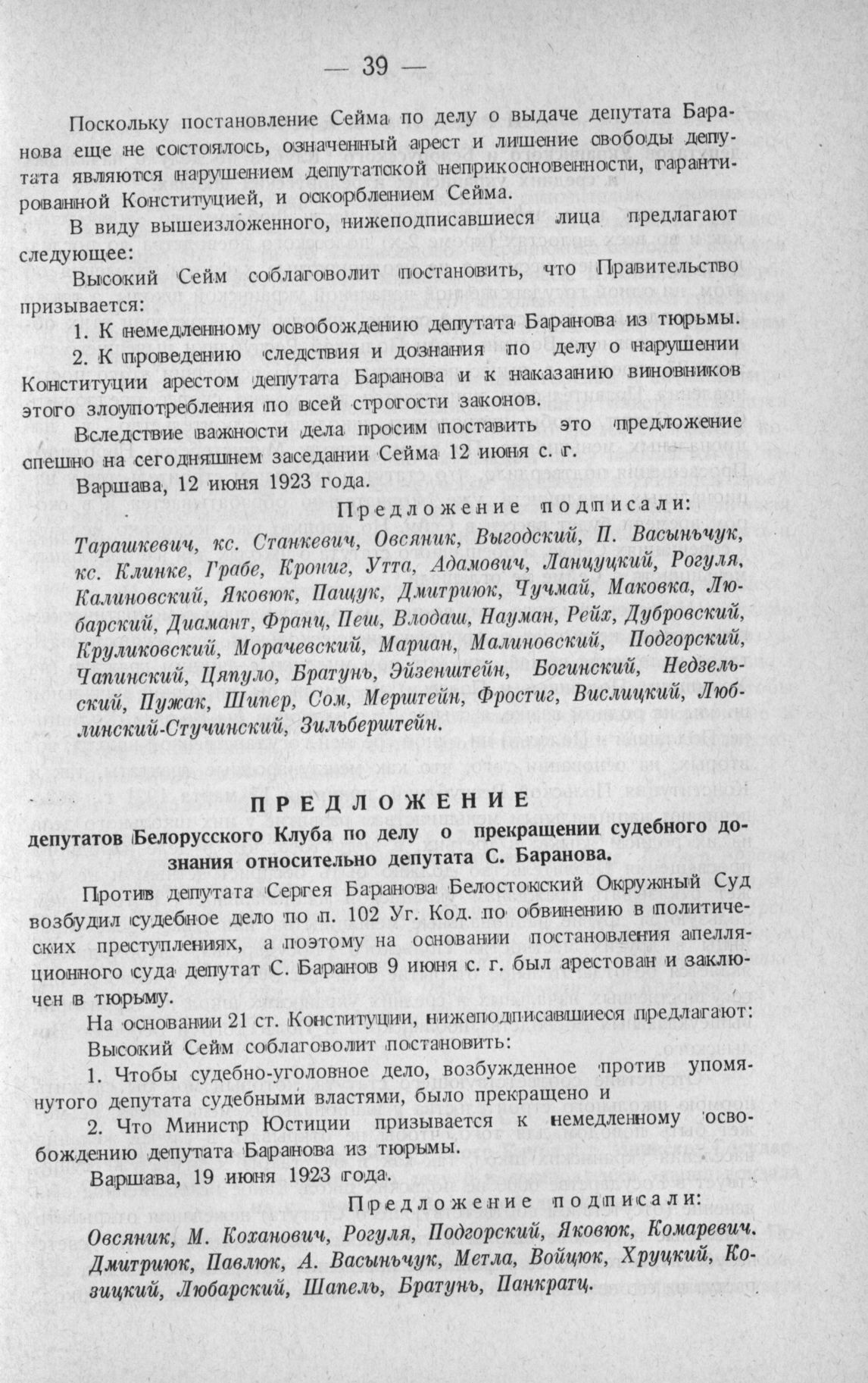 Предложение депутатов Белорусского Клуба по делу о прекращении судебного дознания относительно депутата С. Баранова. Варшава, 19 июня 1923 года