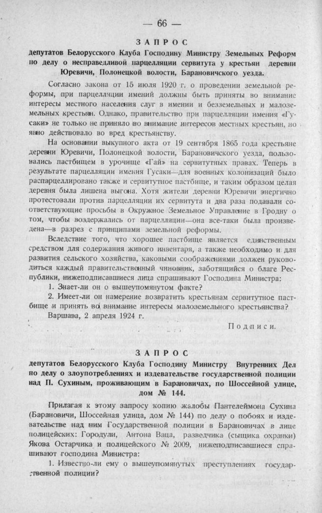 Запрос депутатов Белорусского Клуба Господину Министру Земельных Реформ но делу о несправедливой парцелляции сервитута у крестьян деревни Юревичи, Полонецкой волости, Барановичского уезда. Варшава, 2 апреля 1924 г.