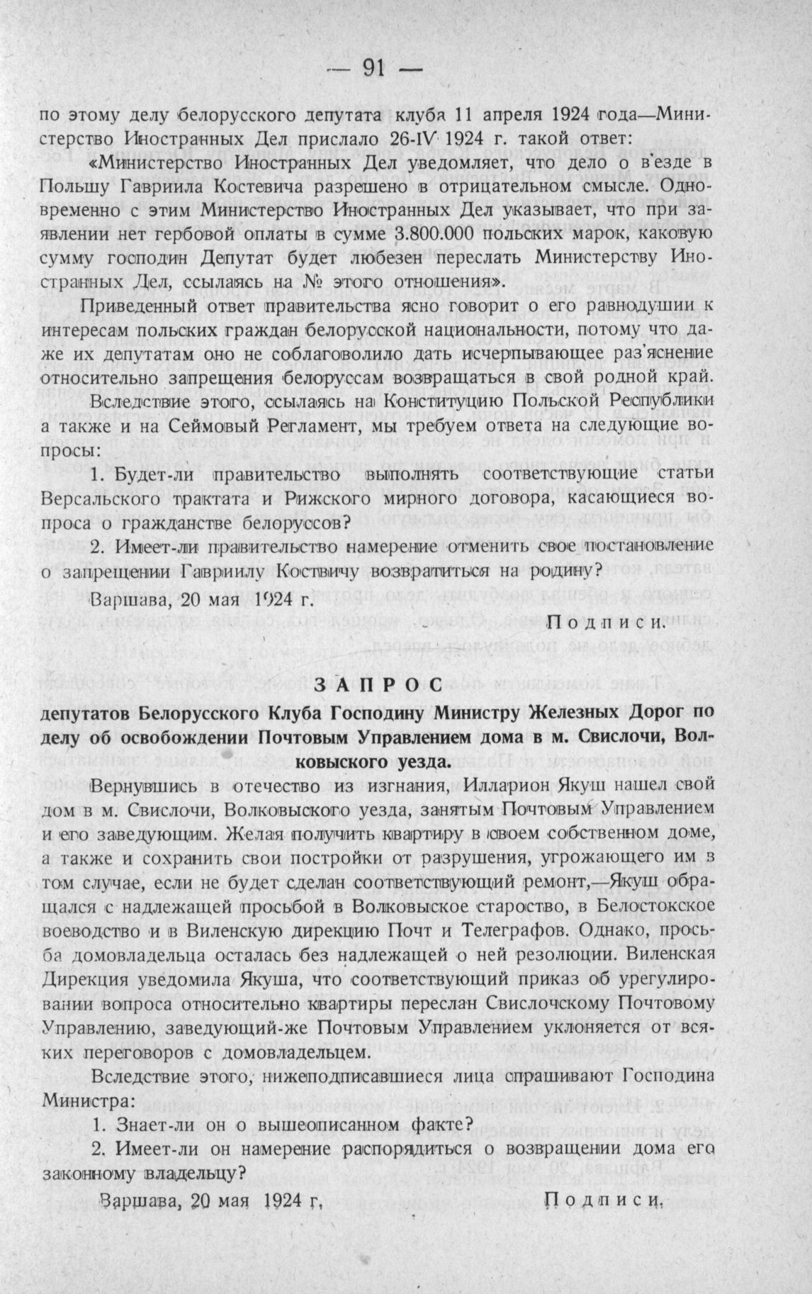 Запрос депутатов Белорусского Клуба Господину Министру Железных Дорог по делу об освобождении Почтовым Управлением дома в м. Свислочи, Волковыского уезда. Варшава, 20 мая 1924 г.