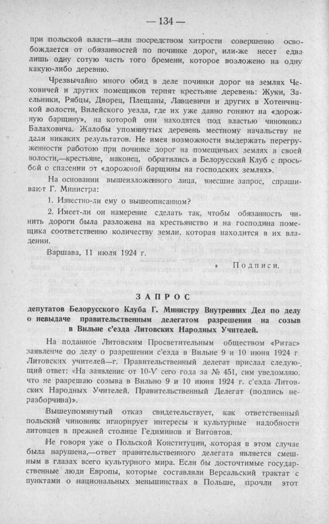 Запрос депутатов Белорусского Клуба Г. Министру Внутренних Дел по делу о невыдаче правительственным делегатом разрешения на созыв в Вильне съезда Литовских Народных Учителей. Варшава, 11 июля 1924 г.