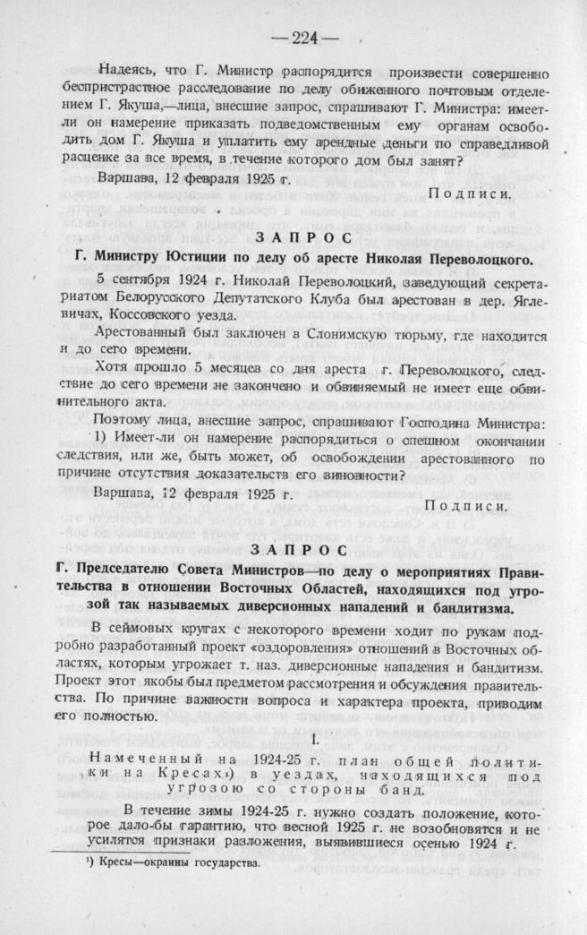 Запрос Г. Председателю Совета Министров—по делу о мероприятиях Правительства в отношении Восточных Областей, находящихся под угрозой так называемых диверсионных нападений и бандитизма. Варшава, 12 февраля 1925 г.