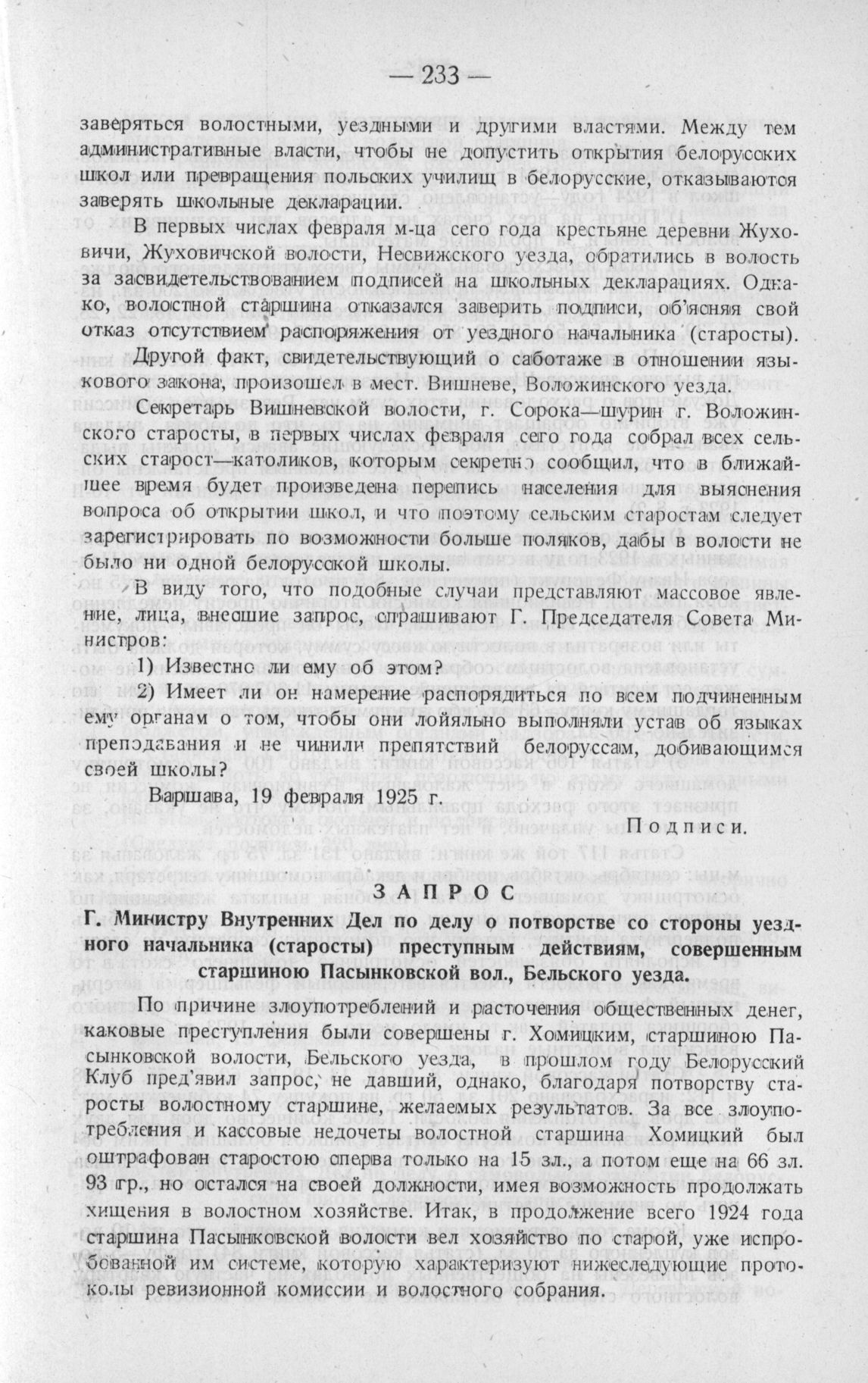 Запрос Г. Министру Внутренних Дел по делу о потворстве со стороны уездного начальника (старосты) преступным действиям, совершенным старшиною Пасынковской вол., Бельского уезда. Варшава, 19 февраля 1925 г.
