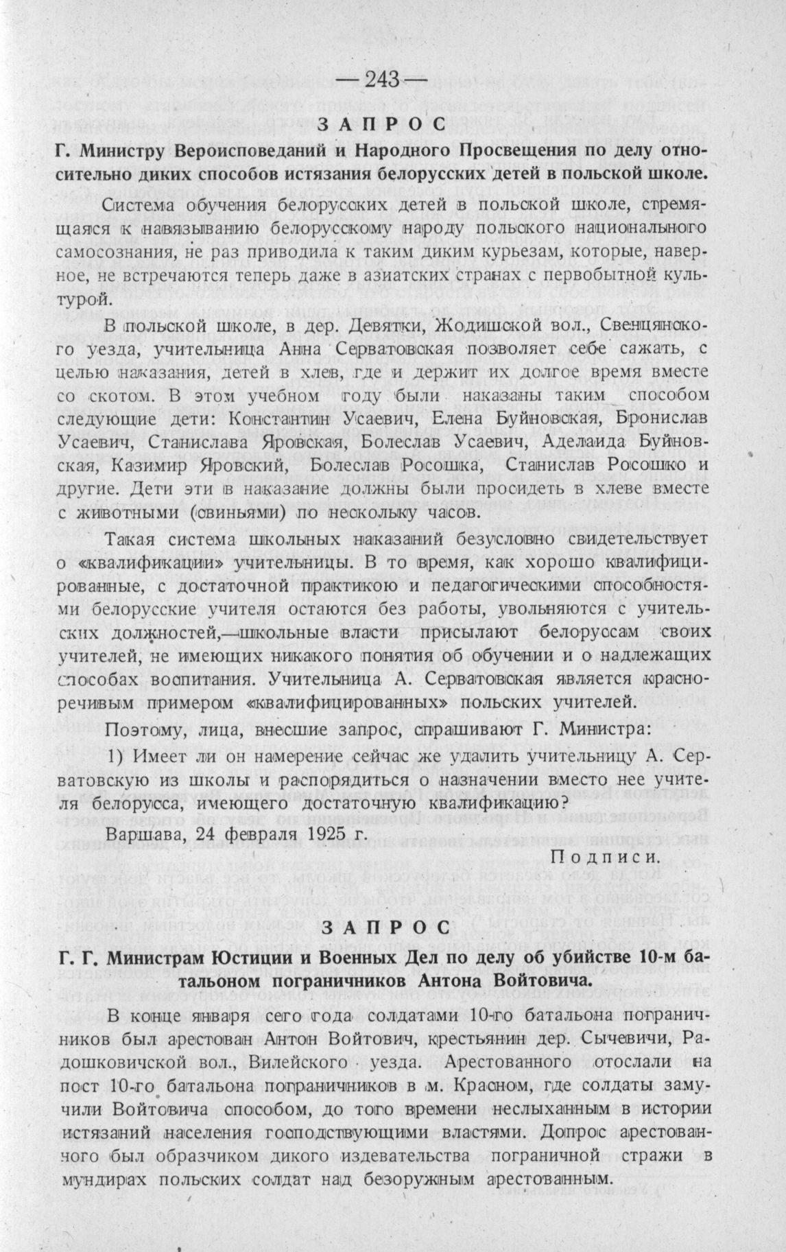 Запрос Министру Вероисповеданий и Народного Просвещения по делу относительно диких способов истязания белорусских детей в польской школе. Варшава, 24 февраля 1925 г.