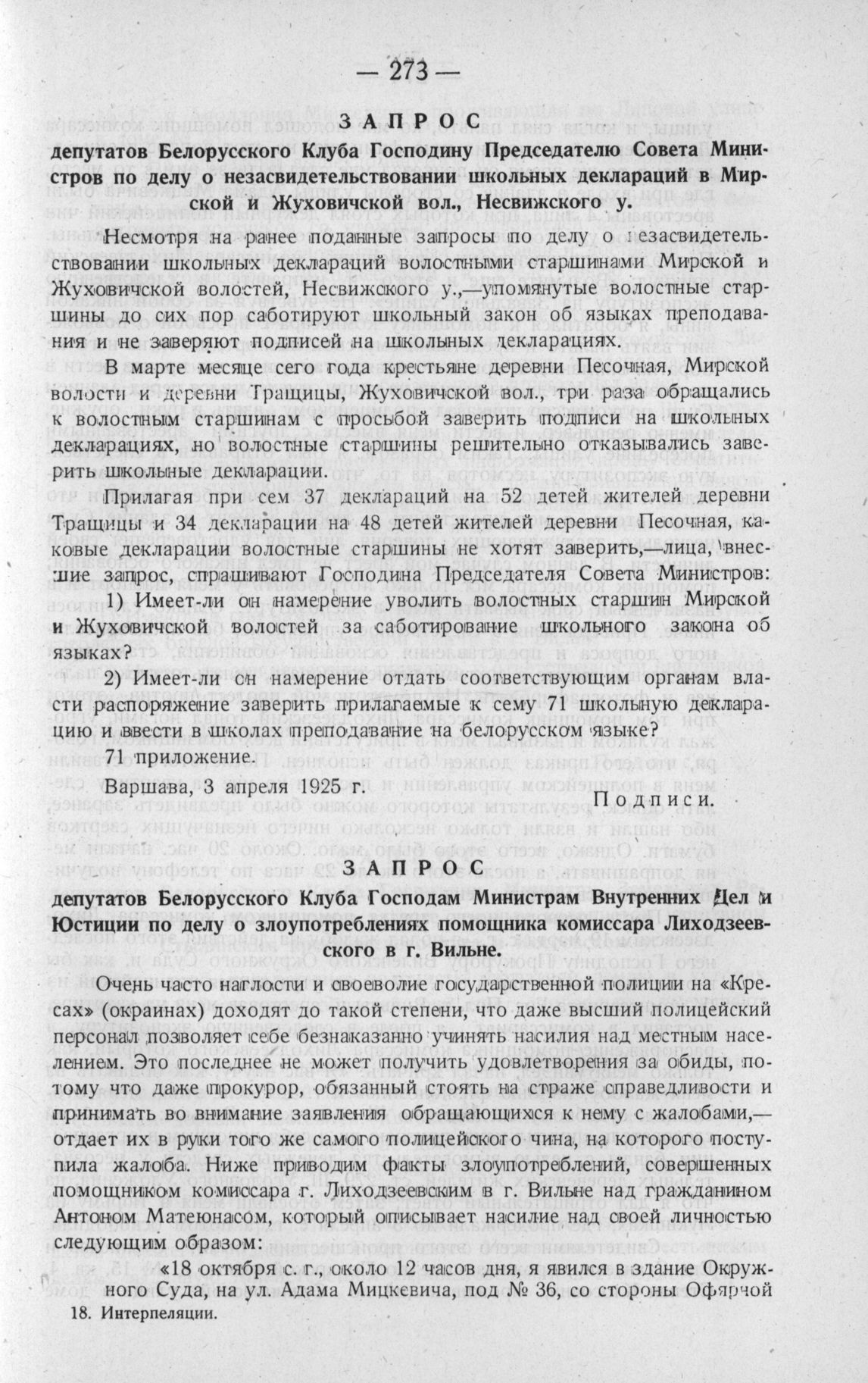 Запрос депутатов Белорусского Клуба Господам Министрам Внутренних Дел (и Юстиции по делу о злоупотреблениях помощника комиссара Лиходзеевского в г. Вильне. Варшава, 17 апреля 1925 года