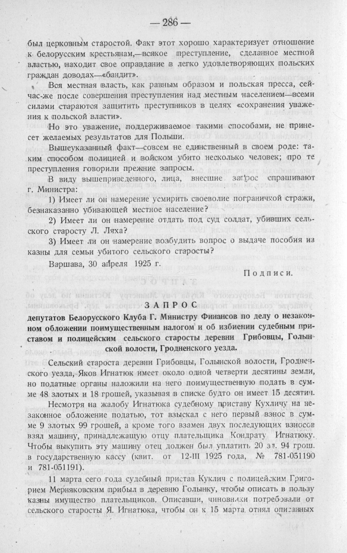 Запрос депутатов Белорусского Клуба Г. Министру Финансов по делу о незаконном обложении поимущественным налогом и об избиении судебным приставом и полицейским сельского старосты деревни Грибовцы, Голынской волости, Гродненского уезда. Варшава, 30 апреля 1925 года