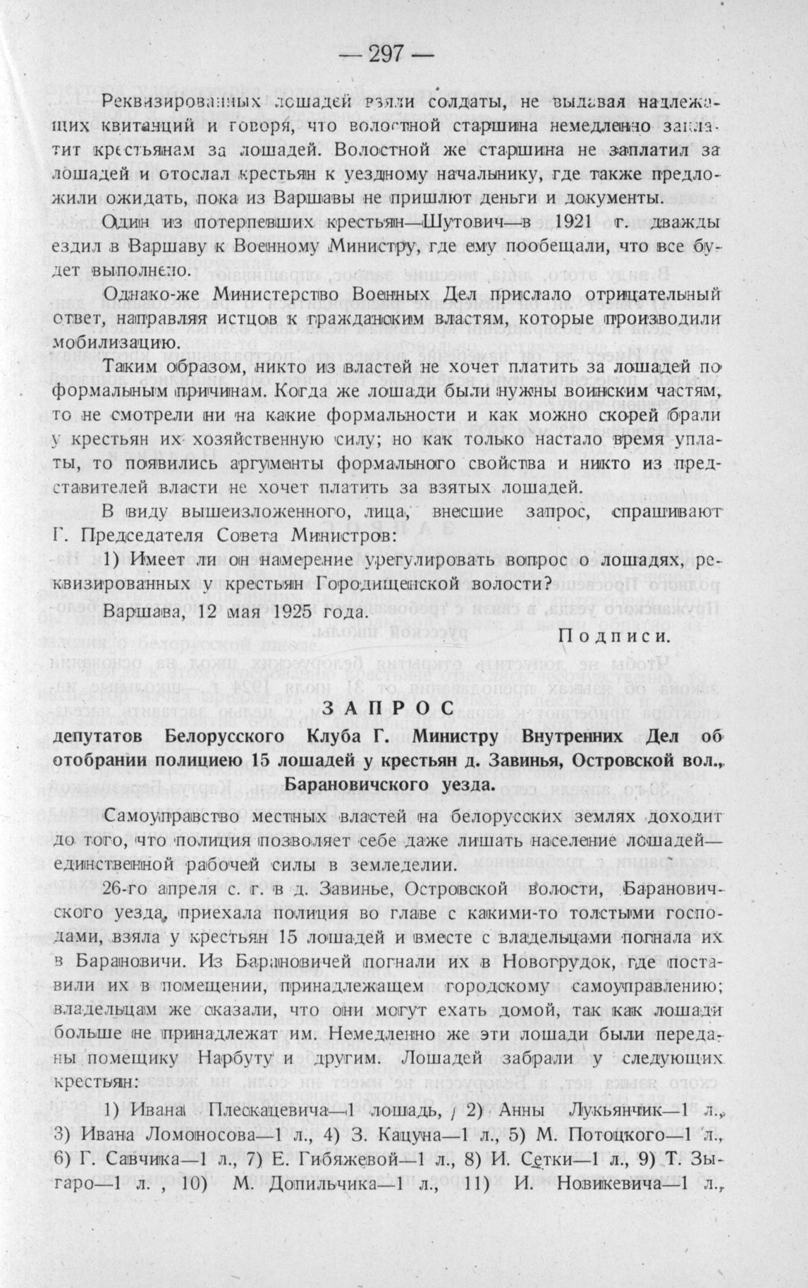Запрос депутатов Белорусского Клуба Г. Министру Внутренних Дел об отобрании полициею 15 лошадей у крестьян д. Завинья, Островской вол., Барановичского уезда. Варшава, 13 мая 1925 года