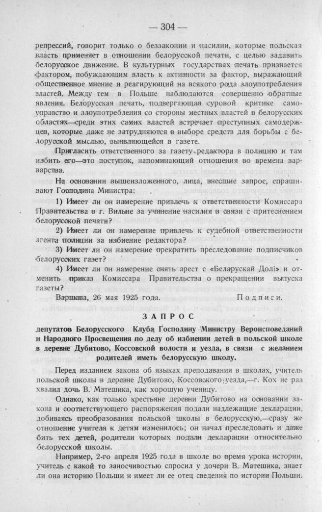 Запрос депутатов Белорусского Клуба; Господину Министру Вероисповеданий и Народного Просвещения по делу об избиении детей в польской школе в деревне Дубитово, Коссовской волости и уезда, в связи с желанием родителей иметь белорусскую школу. Варшава, 26 мая 1925 г.