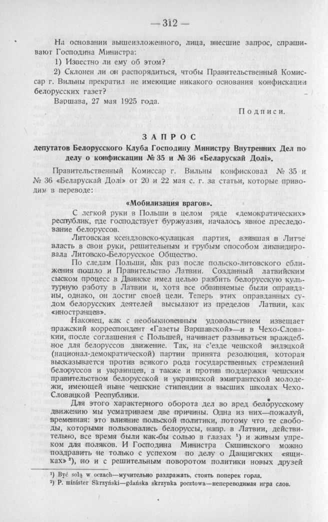 Запрос депутатов Белорусского Клуба Господину Министру Внутренних Дел по делу о конфискации № 35 и № 36 «Беларускай Долi». Варшава, 29 мая 1925 года