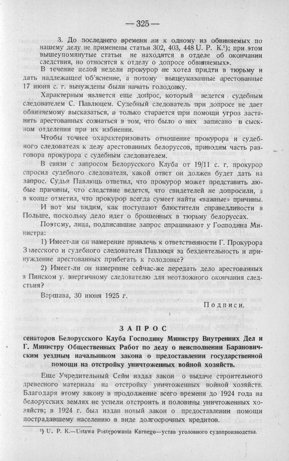 Запрос сенаторов Белорусского Клуба Господину Министру Внутренних Дел и Г. Министру Общественных Работ по делу о неисполнении Барановичским уездным начальником закона о предоставлении государственной помощи на отстройку уничтоженных войной хозяйств. Варшава, 1 июля 1925 г.