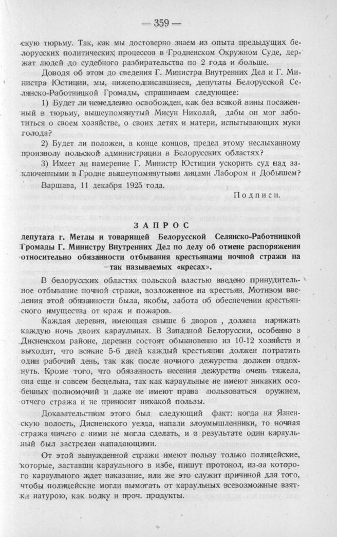 Запрос депутата г. Метлы и товарищей Белорусской Селянско-Работницкой Громады Г. Министру Внутренних Дел по делу об отмене распоряжения относительно обязанности отбывания крестьянами ночной стражи на так называемых «кресах». Варшава, 12 декабря 1925 года