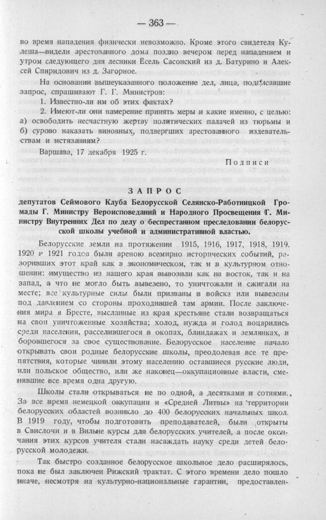 Запрос депутатов Сеймового Клуба Белорусской Селянско-Работницкой Громады Г. Министру Вероисповеданий и Народного Просвещения Г. Министру Внутренних Дел по делу о беспрестанном преследовании белорусской школы учебной и административной властью. Варшава, 30 декабря 1925 г.
