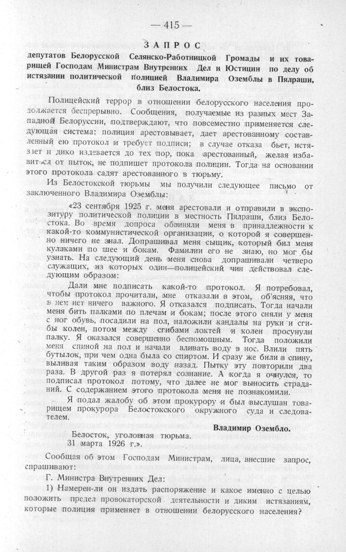 Запрос депутатов Белорусской Селянско-Работницкой Громады и их товарищей Господам Министрам Внутренних Дел и Юстиции по делу об истязании политической полицией Владимира Оземблы в Пялраши, близ Белостока. Варшава, 20 апреля 1926 г.