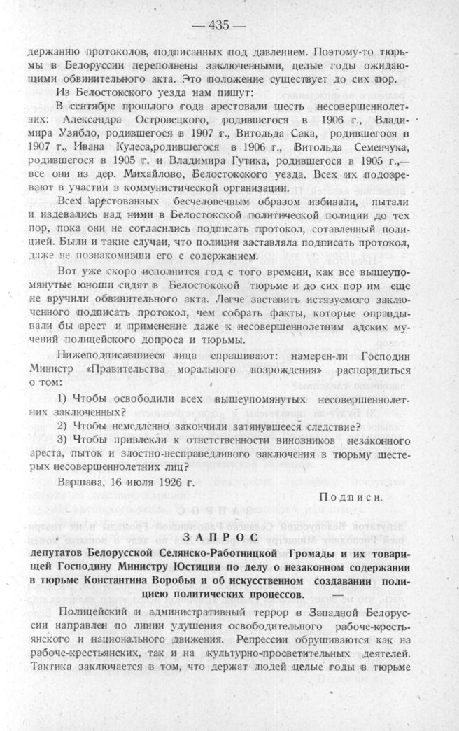 Запрос депутатов Белорусской Селянско-Работницкой Громады и их товарищей Господину Министру Юстиции по делу о незаконном содержании в тюрьме Константина Воробья и об искусственном создавании полициею политических процессов. Варшава, 16 июля 1926 г.