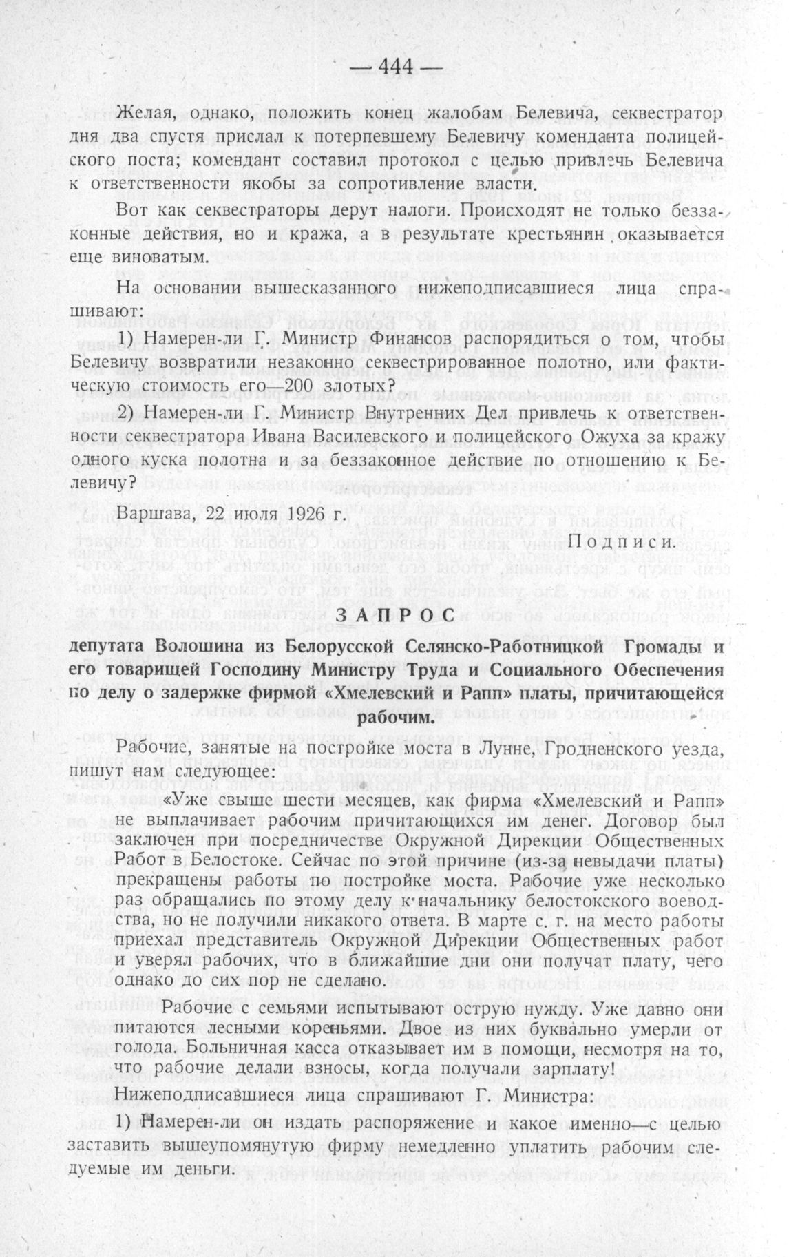 Запрос депутата Волошина из Белорусской Селянско-Работницкой Громады и его товарищей Господину Министру Труда и Социального Обеспечения по делу о задержке фирмой «Хмелевский и Рапп» платы, причитающейся рабочим. Варшава, 22 июля 1926 г.