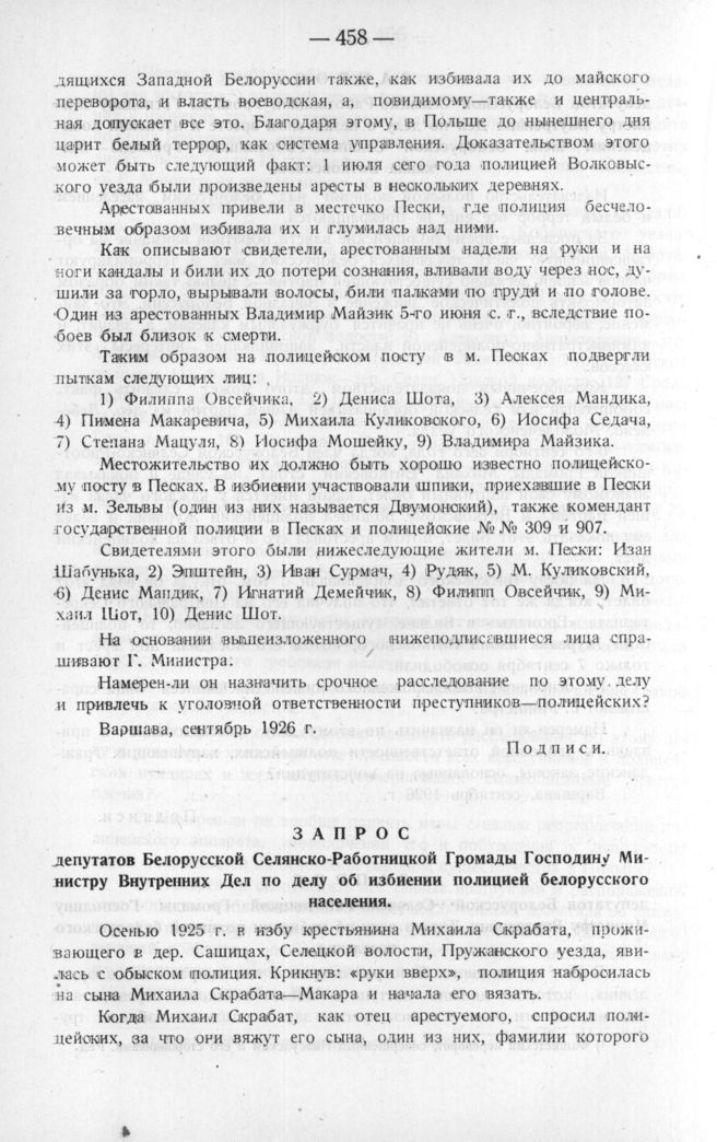 Запрос депутатов Белорусской Селянско-Работницкой Громады Господину Министру Внутренних Дел по делу об избиении полицией белорусского населения [2]. Варшава, сентябрь 1926 г.