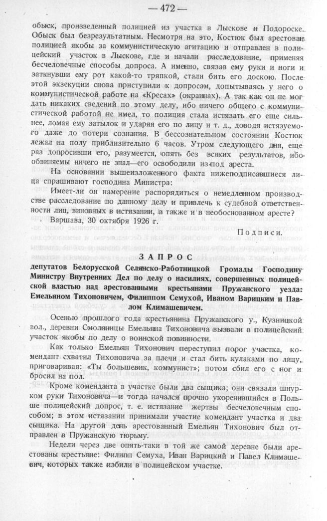 Запрос депутатов Белорусской Селянско-Работницкой Громады Господину Министру Внутренних Дел по делу о насилиях, совершенных полицейской властью над арестованными крестьянами Пружанского уезда: Емельяном Тихоновичем, Филиппом Семухой, Иваном Варицким и Павлом Климашевичем. Варшава, 30 октября 1926 г.