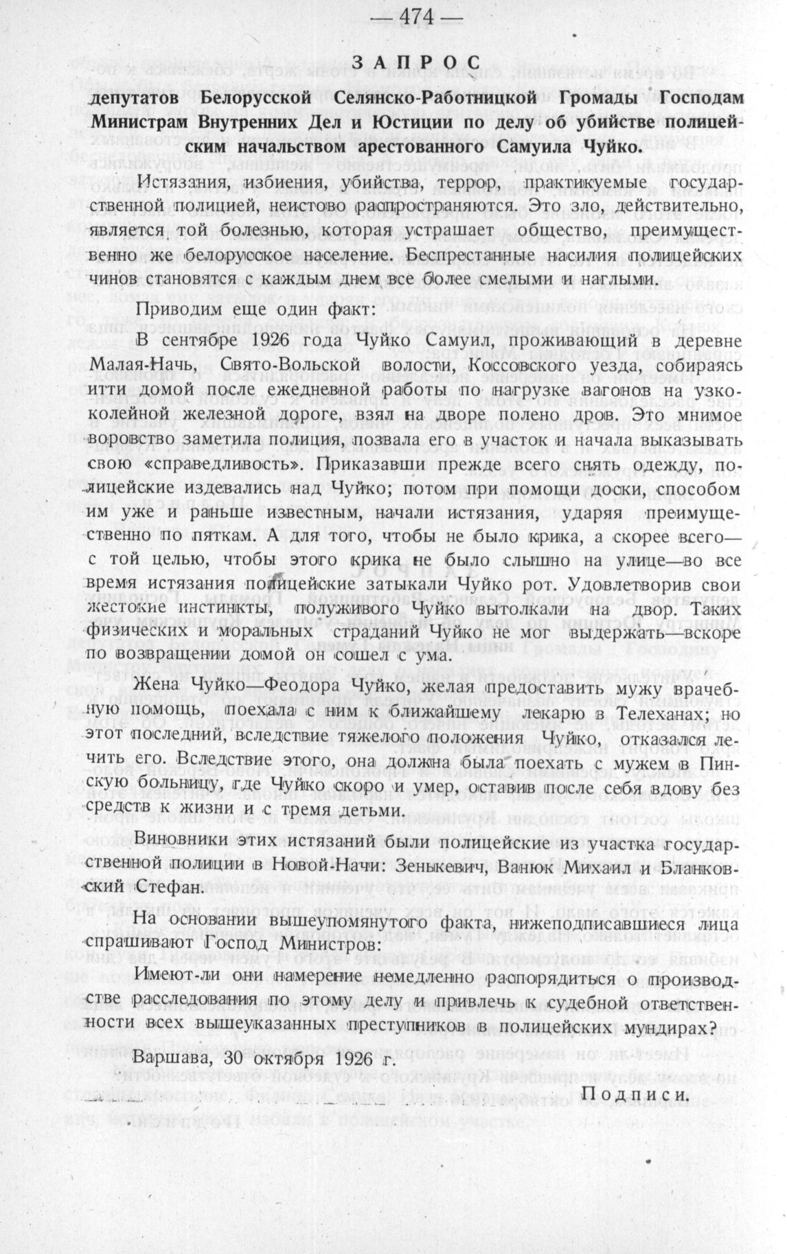 Запрос депутатов Белорусской Селянско-Работницкой Громады Господам Министрам Внутренних Дел и Юстиции по делу об убийстве полицейским начальством арестованного Самуила Чуйко. Варшава, 30 октября 1926 г.