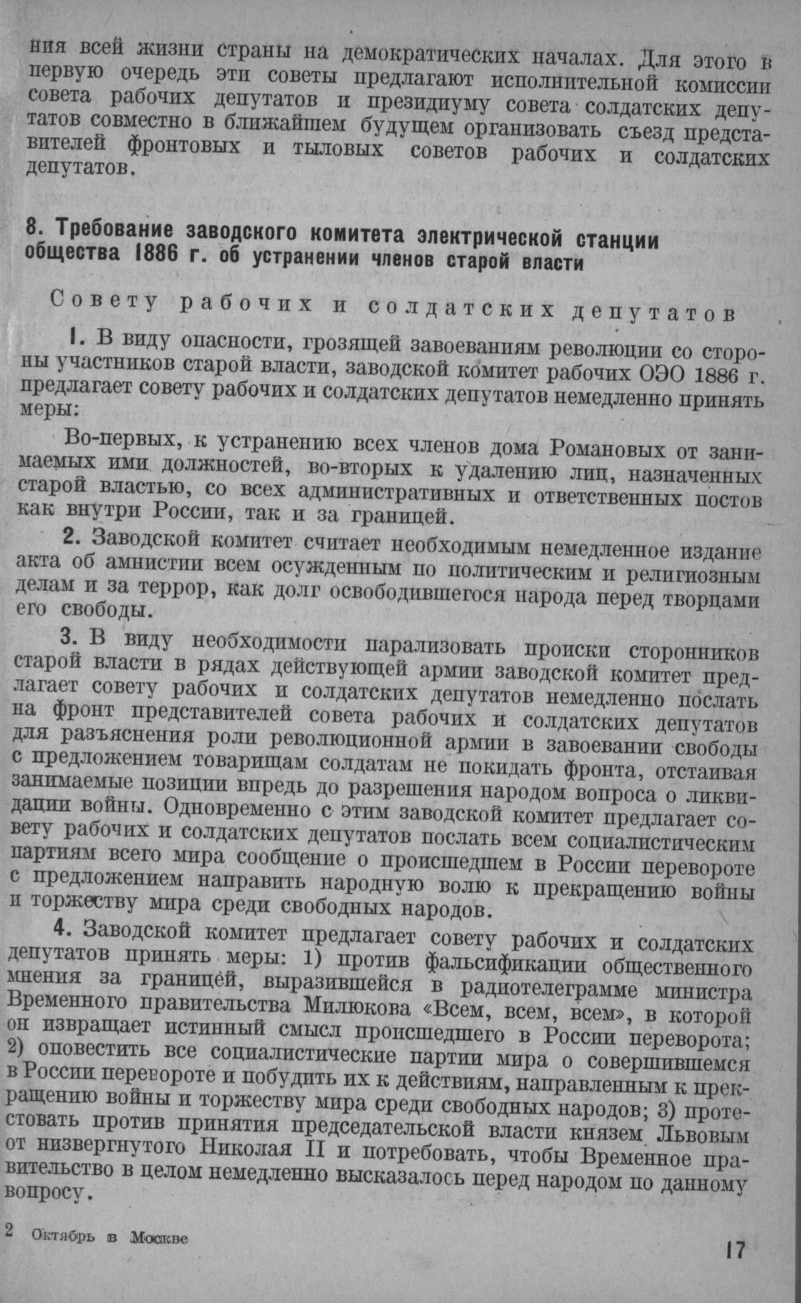 Требование заводского комитета электрической станции общества 1886 г. об устранении членов старой власти. Совету рабочих и солдатских депутатов