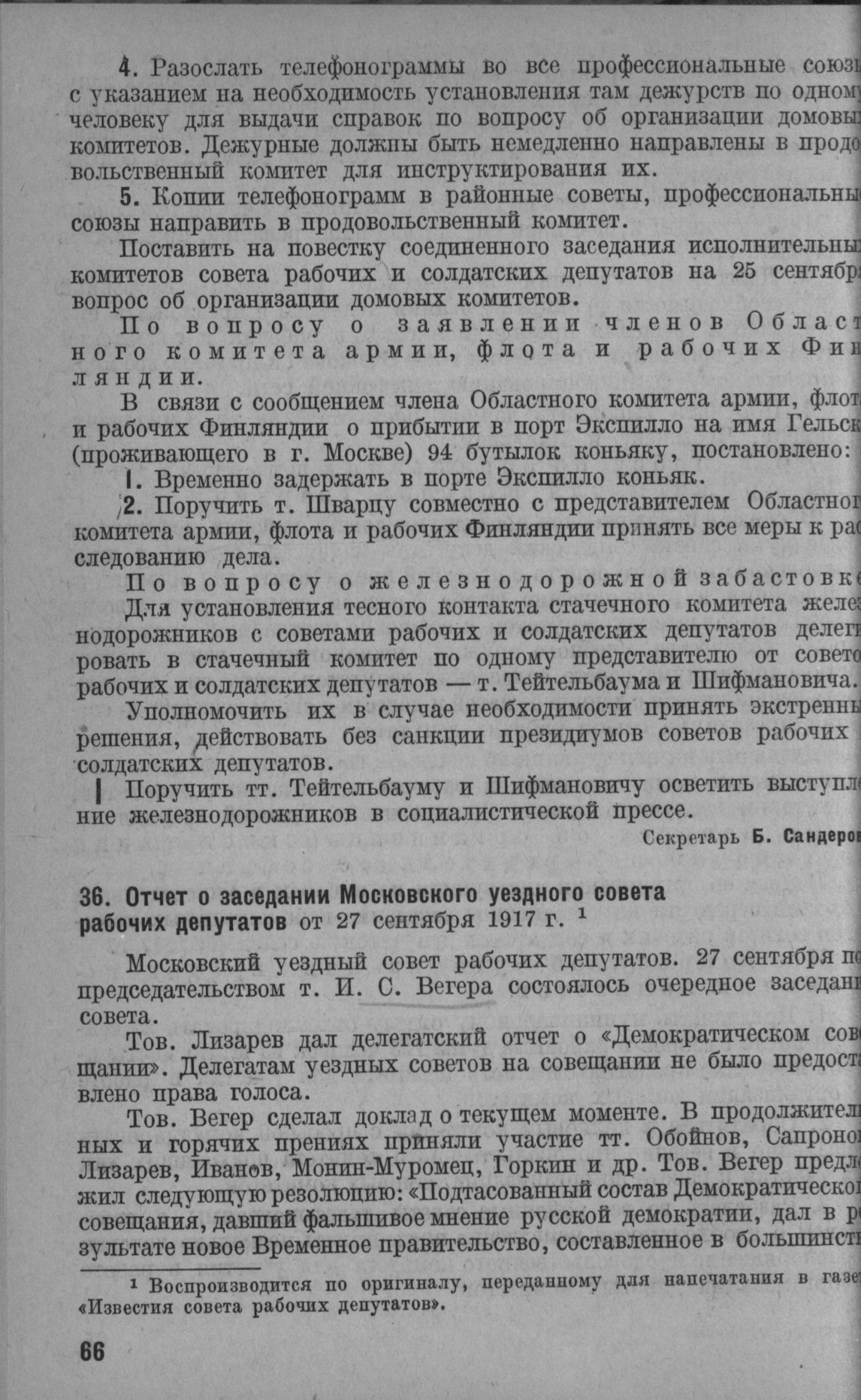 Отчет о заседании Московского уездного совета рабочих депутатов от 27 сентября 1917 г. // Воспроизводится по оригиналу, переданному для напечатания в газету «Известия совета рабочих депутатов».