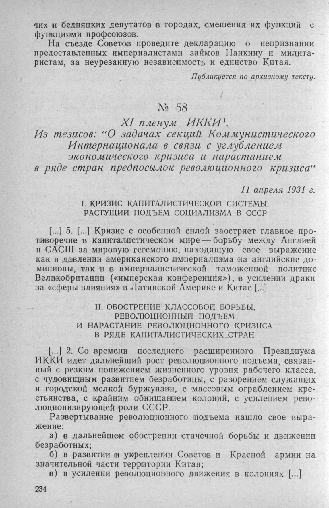 XI пленум ИККИ. Из тезисов: “О задачах секций Коммунистического Интернационала в связи с углублением экономического кризиса и нарастанием в ряде стран предпосылок революционного кризиса“. 11 апреля 1931 г.