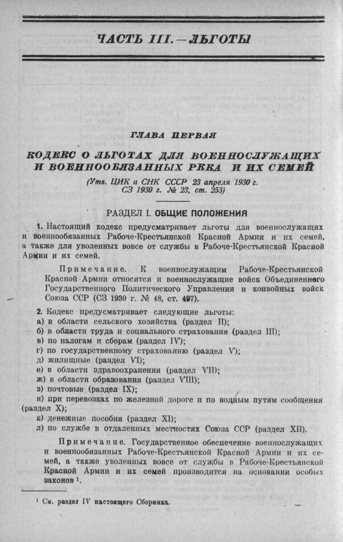 Кодекс о льготах для военнослужащих и военнообязанных РККА и их семей (Утв. ЦИК и СНК СССР 23 апреля 1930 г.)
