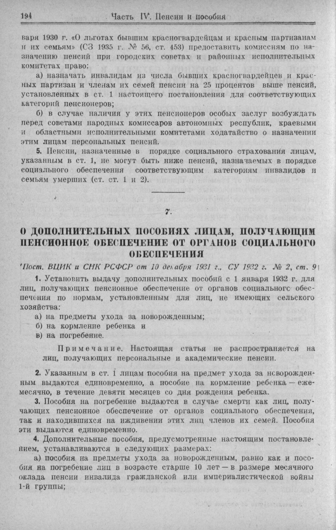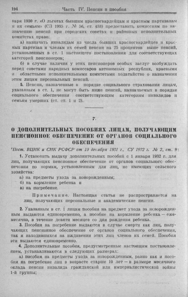 О дополнительных пособиях лицам, получающим пенсионное обеспечение от органов социального обеспечения (Пост. ВЦИК и СНК РСФСР от 10 декабря 1931 г.) // СУ 1932 г. № 2. ст. 9.