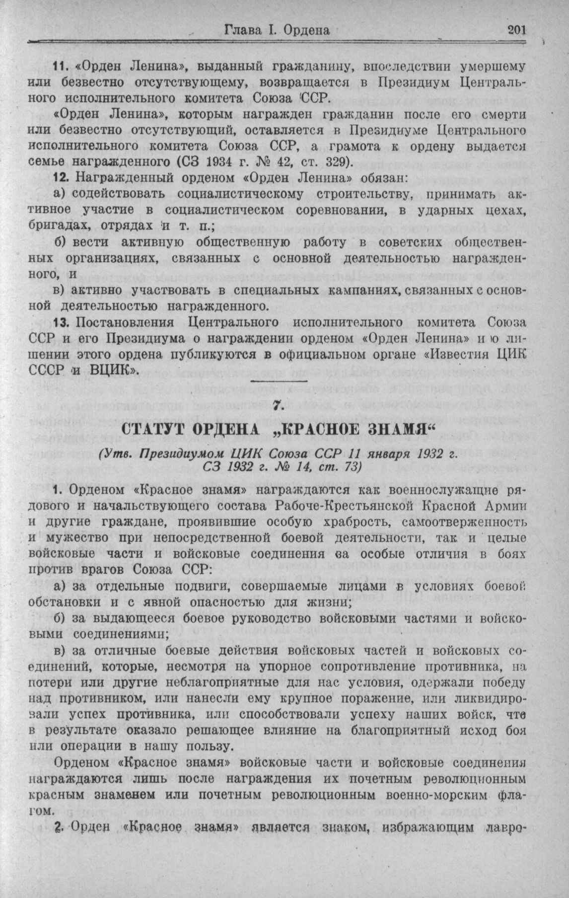 Статут ордена «Красное Знамя» (Утв. Президиумом ЦИК Союза ССР 11 января 1932 г.) // СЗ 1932 г. № 14. ст. 73.
