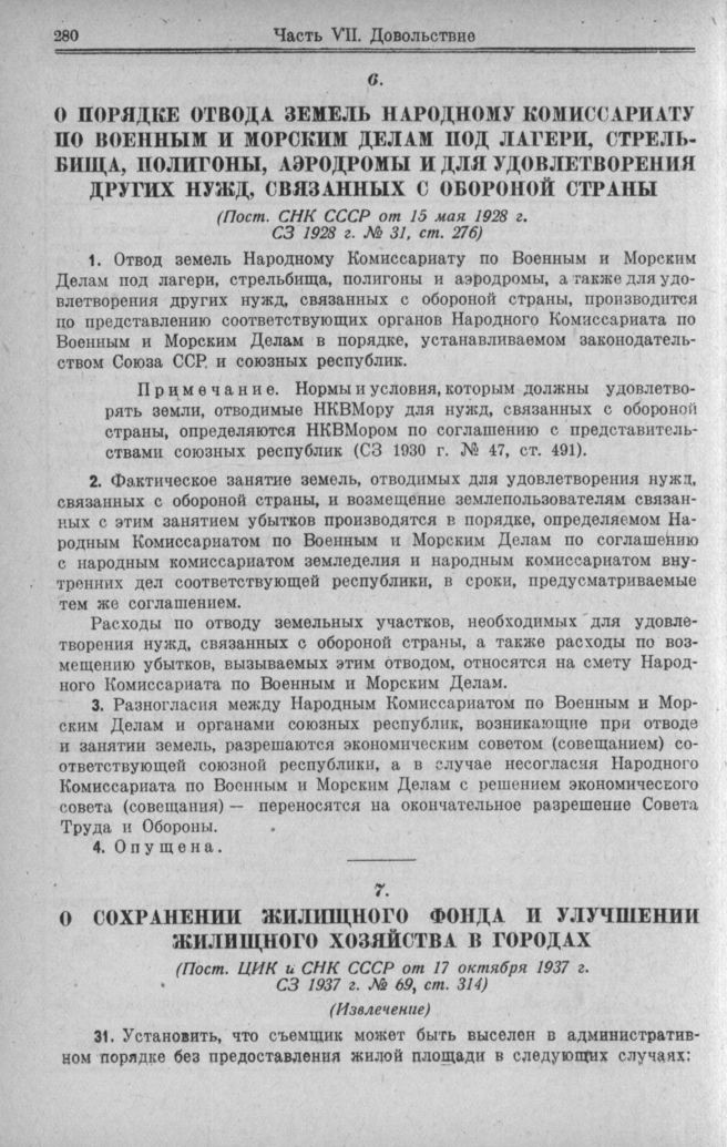 О порядке отвода земель Народному комиссариату но военным и морским делам под лагери, стрельбища, полигоны, аэродромы и для удовлетворения других нужд, связанных с обороной страны (Пост. СНК СССР от 15 мая 1928 г.) // СЗ 1928 г. № 31. ст. 276.