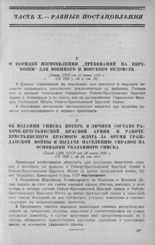 О порядке изготовления «Требований на перевозки» для военного и морского ведомств (Пост. СТО от 13 июня 1924 г.) // СЗ 1925 г. № 3. ст. 39.