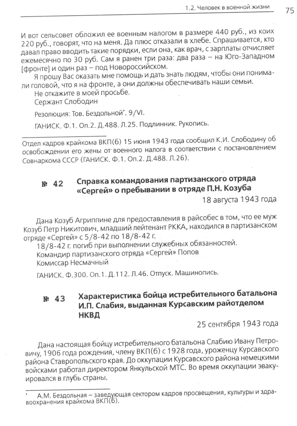 Справка командования партизанского отряда «Сергей» о пребывании в отряде П.Н. Козуба. 18 августа 1943 года // ГАНИСК. Ф. 300. Оп. 1. Д. 112. Л. 46. Отпуск. Машинопись.