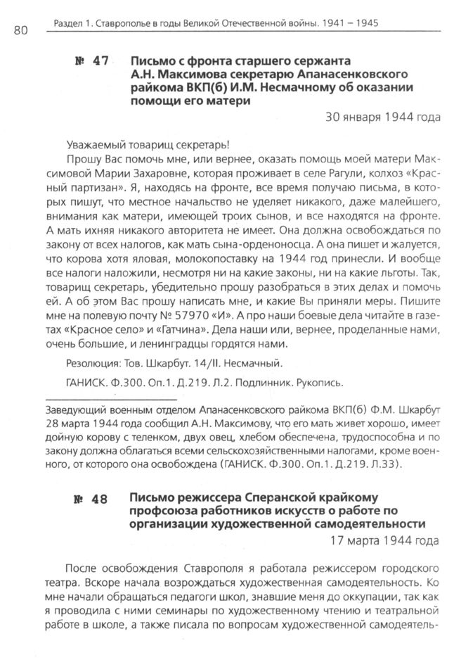 Письмо с фронта старшего сержанта А.Н. Максимова секретарю Апанасенковского райкома ВКП(б) И.М. Несмачному об оказании помощи его матери. 30 января 1944 года // ГАНИСК. Ф. 300. Оп. 1. Д. 219. Л. 2. Подлинник. Рукопись.