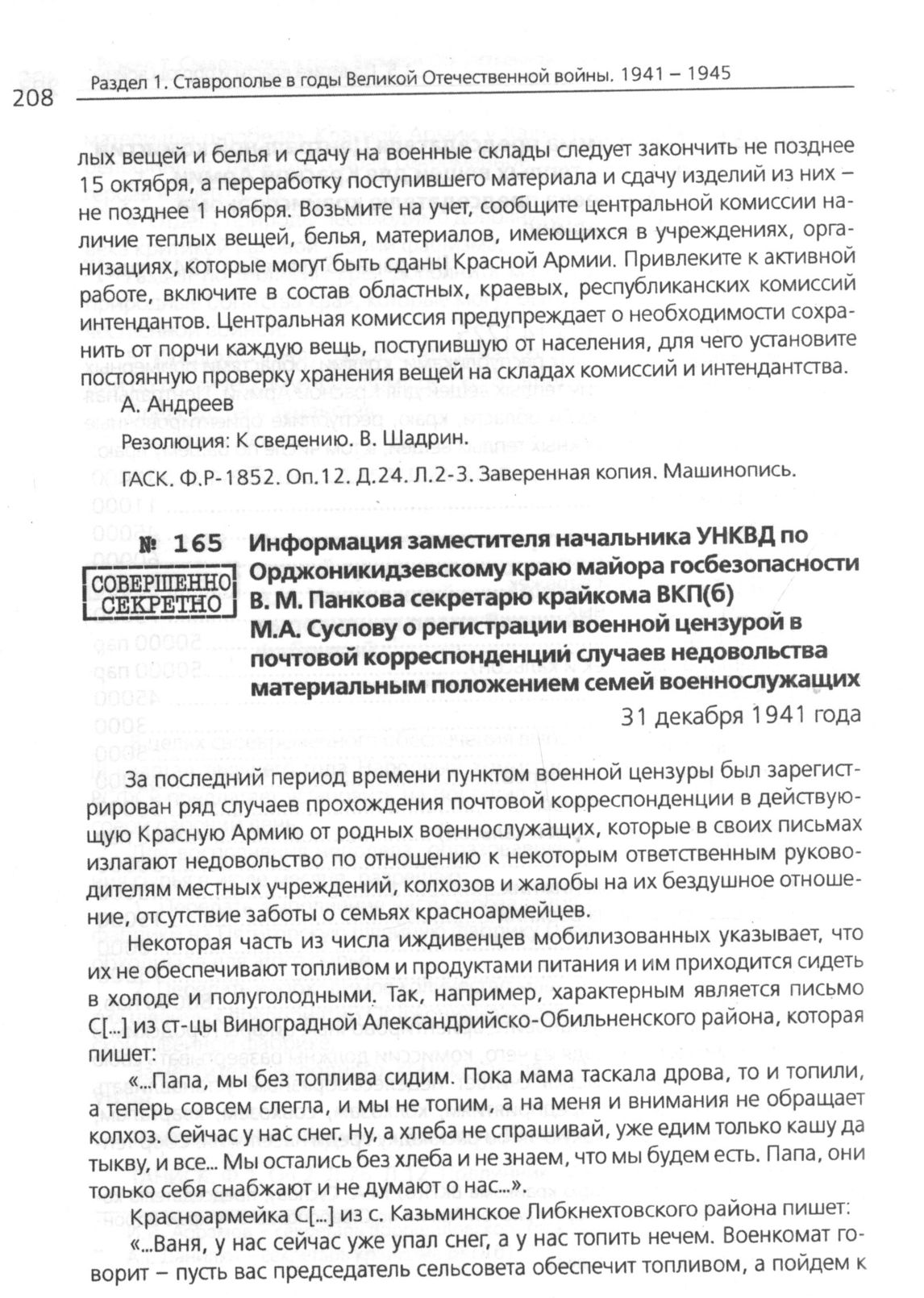 Информация заместителя начальника УНКВД по Орджоникидзевскому краю майора госбезопасности В.М. Панкова секретарю крайкома ВКП(б) М.А. Суслову о регистрации военной цензурой в почтовой корреспонденций случаев недовольства материальным положением семей военнослужащих. 31 декабря 1941 года