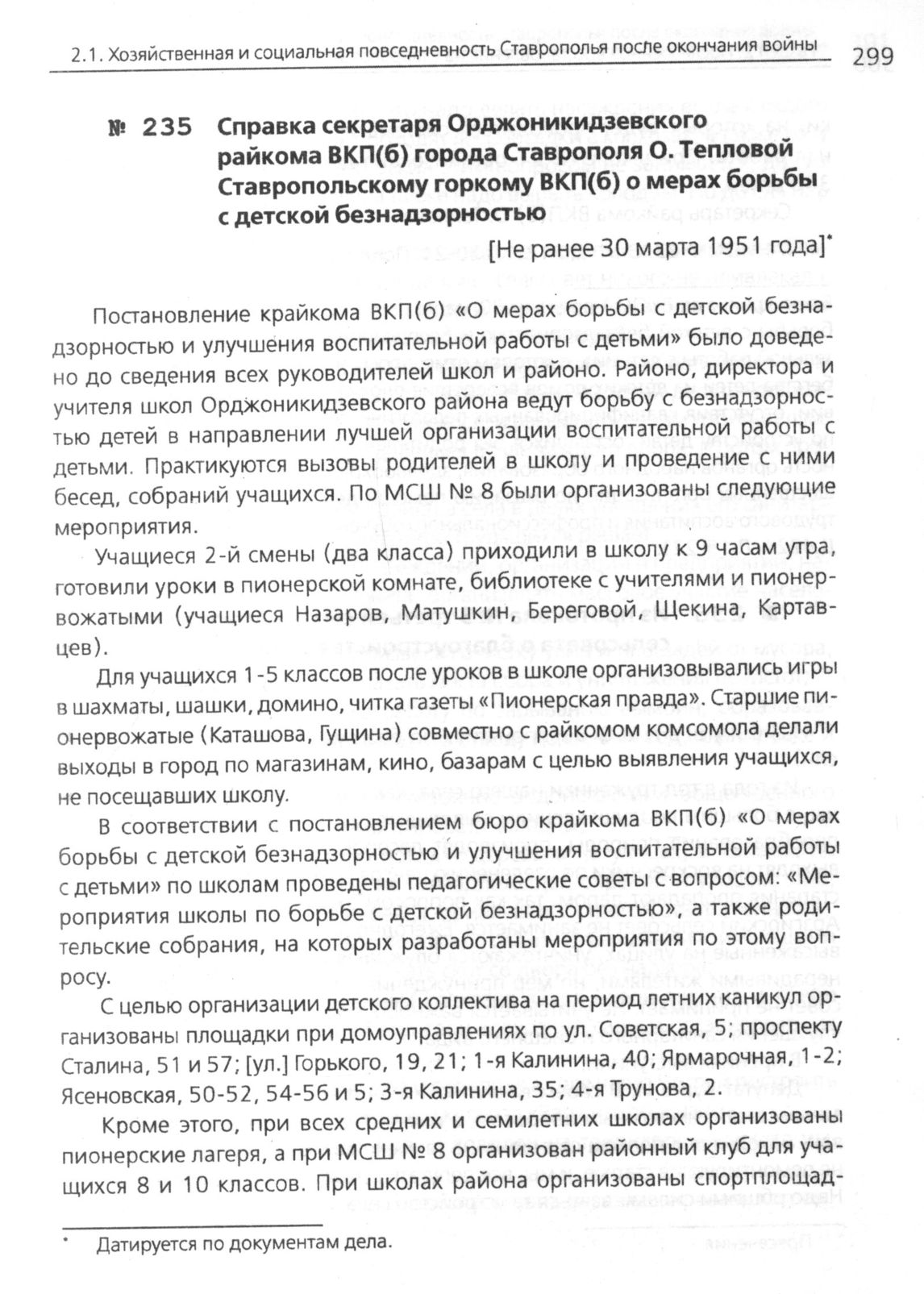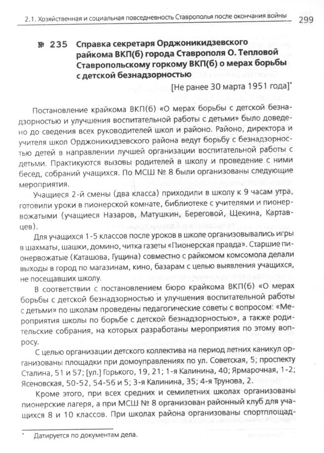 Справка секретаря Орджоникидзевского райкома ВКП(б) города Ставрополя О. Тепловой Ставропольскому горкому ВКП(б) о мерах борьбы с детской безнадзорностью. [Не ранее 30 марта 1951 года] // ГАНИСК. Ф. 23. Оп. 1. Д. 2123. Л. 20-21. Подлинник. Машинопись.