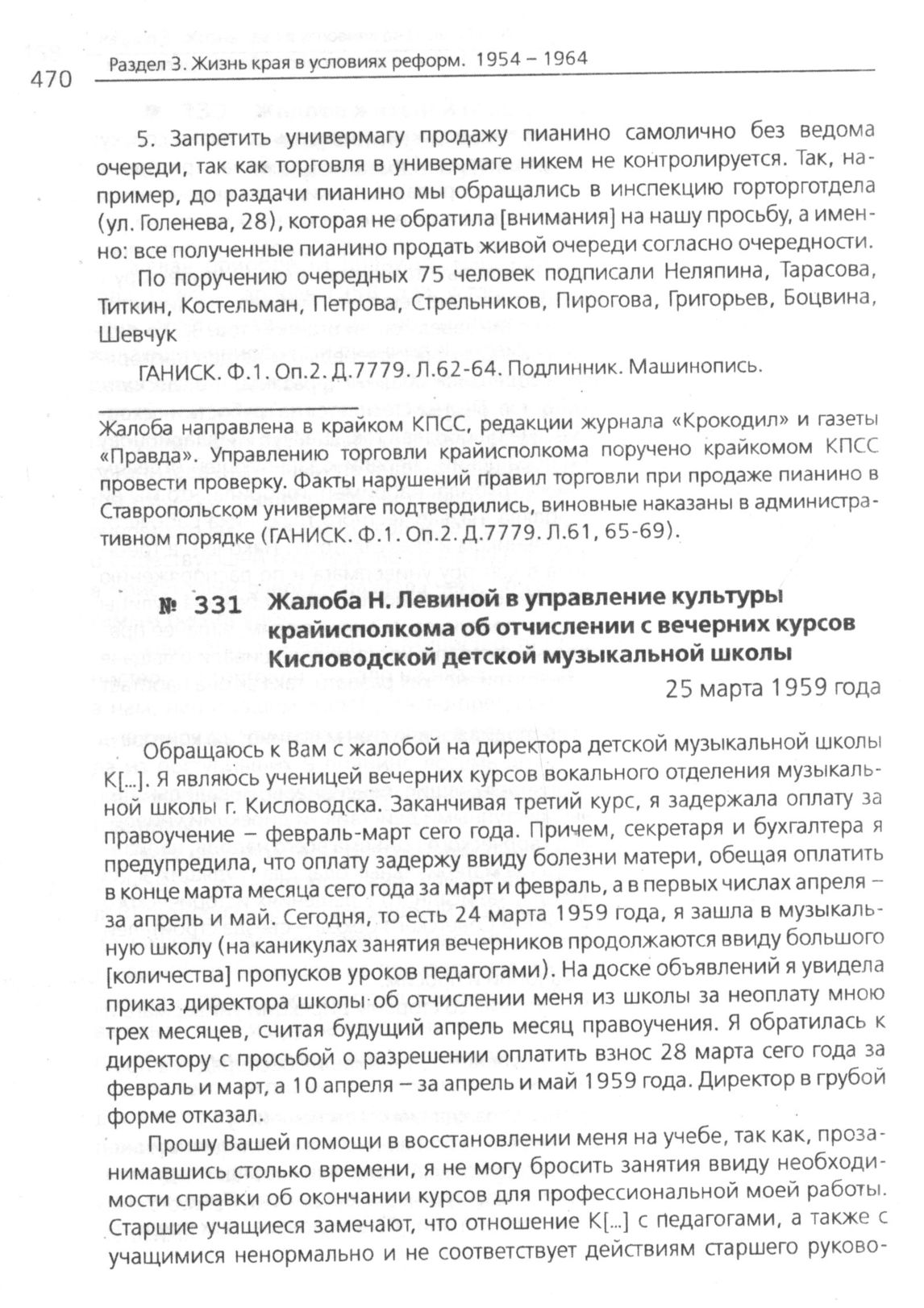 Жалоба Н. Левиной в управление культуры крайисполкома об отчислении с вечерних курсов Кисловодской детской музыкальной школы. 25 марта 1959 год // ГАНИСК. Ф. 1. Оп. 2. Д. 8466. Л. 193-194. Копия. Машинопись.