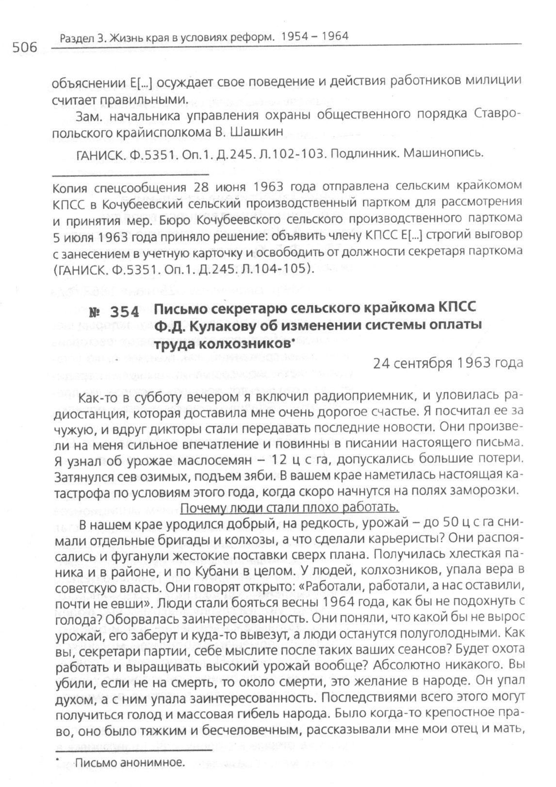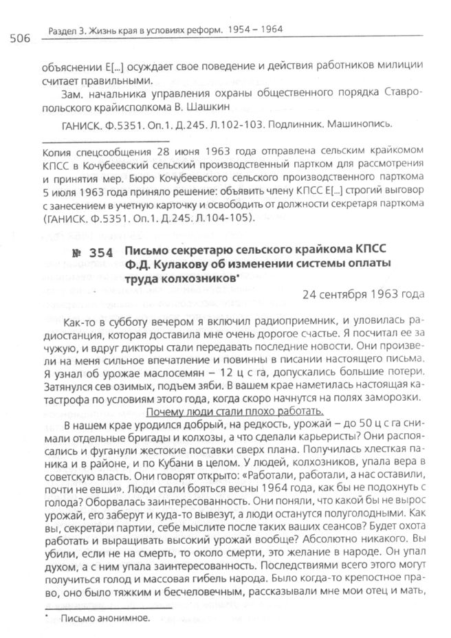Письмо секретарю сельского крайкома КПСС Ф.Д. Кулакову об изменении системы оплаты труда колхозников. 24 сентября 1963 года // ГАНИСК. Ф. 5351. Оп. 1. Д. 251. Л. 136-139. Подлинник. Машинопись.