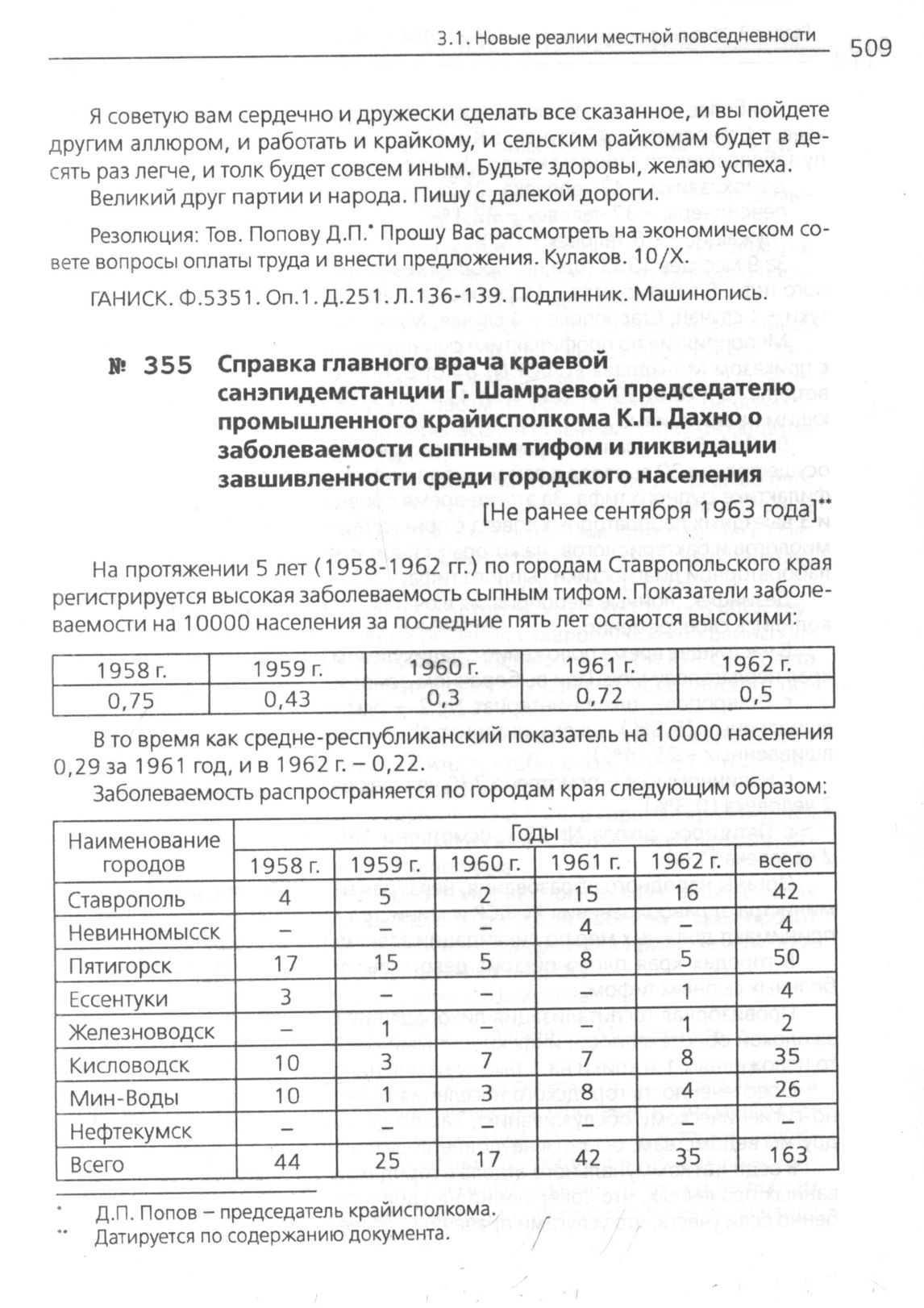 Справка главного врача краевой санэпидемстанции Г. Шамраевой председателю промышленного крайисполкома К.П. Дахно о заболеваемости сыпным тифом и ликвидации завшивленности среди городского населения. [Не ранее сентября 1963 года] // ГАСК. Ф. Р-1852. Оп. 12. Д. 236. Л. 19-23. Подлинник. Машинопись.