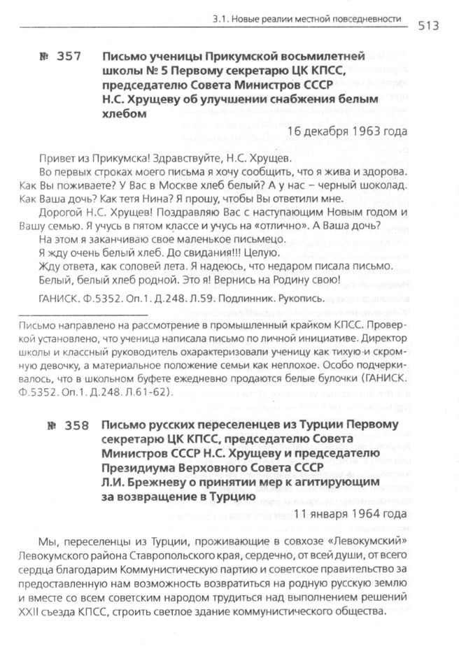 Письмо русских переселенцев из Турции Первому секретарю ЦК КПСС, председателю Совета Министров СССР Н.С. Хрущеву и председателю Президиума Верховного Совета СССР Л.И. Брежневу о принятии мер к агитирующим за возвращение в Турцию. 11 января 1964 года // ГАНИСК. Ф. 5351. Оп. 1. Д. 331. Л. 5-7. Подлинник. Рукопись.