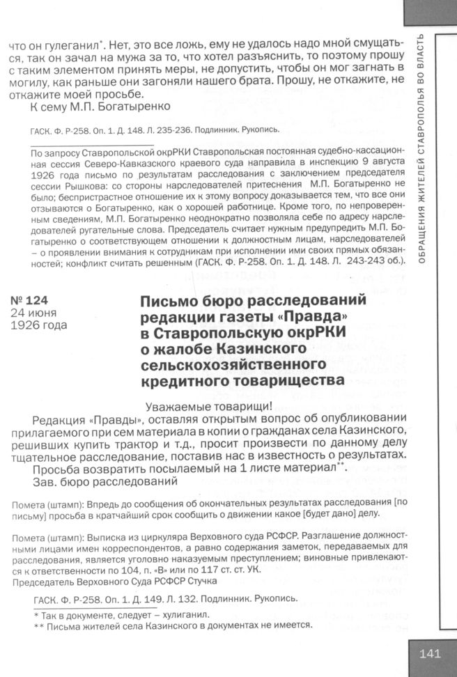 Письмо бюро расследований редакции газеты «Правда» в Ставропольскую окрРКИ о жалобе Казинского сельскохозяйственного кредитного товарищества. 24 июня 1926 года // ГАСК. Ф. P-258. Oп. 1. Д. 149. Л. 132. Подлинник. Рукопись.