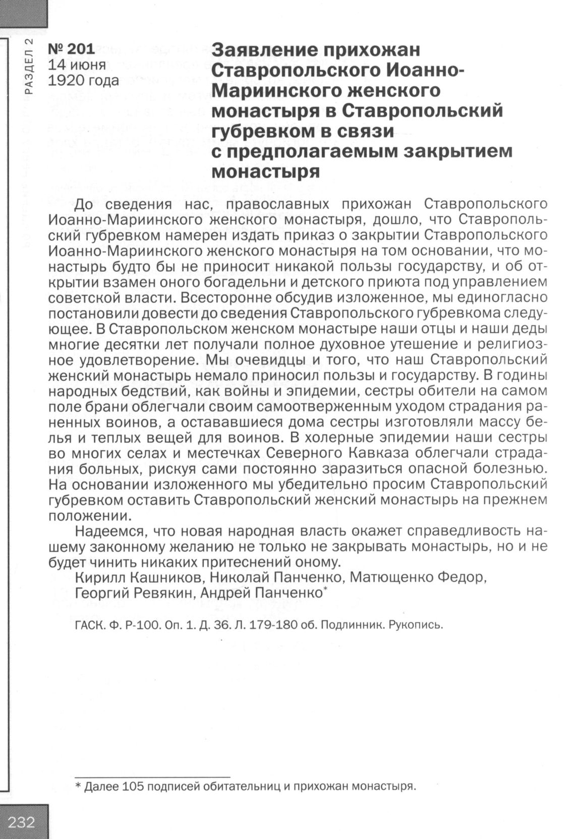 Заявление прихожан Ставропольского Иоанно-Мариинского женского монастыря в Ставропольский губревком в связи с предполагаемым закрытием монастыря. 14 июня 1920 года