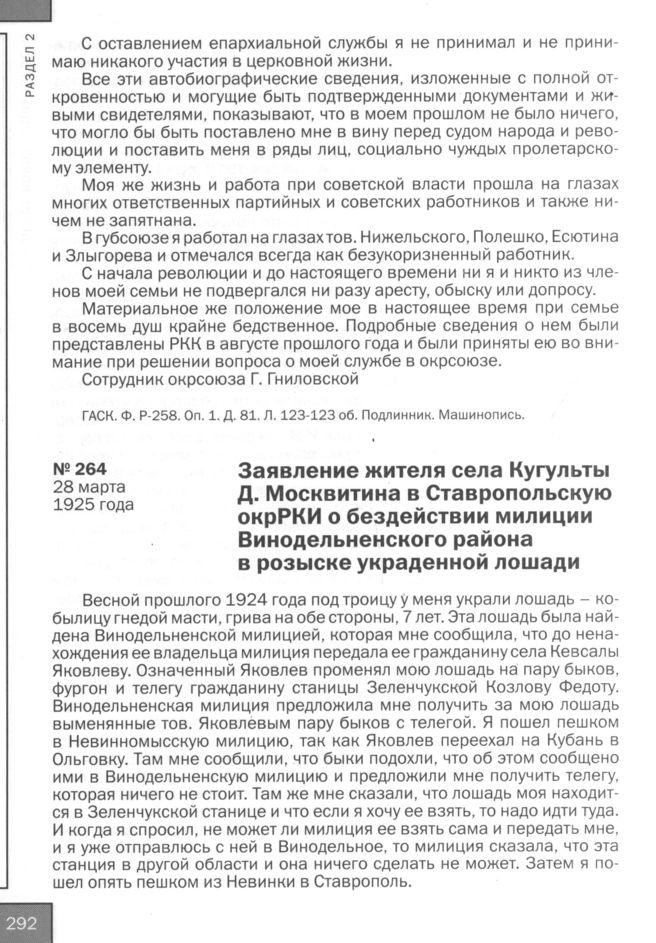 Заявление жителя села Кугульты Д. Москвитина в Ставропольскую окрРКИ о бездействии милиции Винодельненского района в розыске украденной лошади. 28 марта 1925 года // ГАСК. Ф. Р-258. Oп. 1. д. 116. Л. 207. Копия. Машинопись.