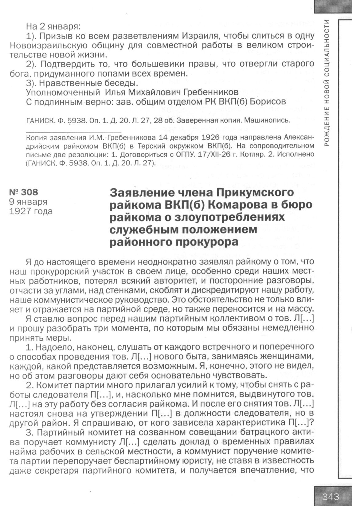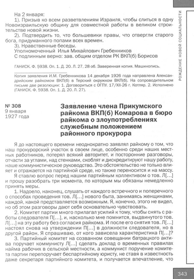 Заявление члена Прикумского райкома ВКП(б) Комарова в бюро райкома о злоупотреблениях служебным положением районного прокурора. 9 января 1927 года // ГАНИСК. Ф. 5938. Oп. 1. Д. 15. Л. 29-30. Подлинник. Рукопись.