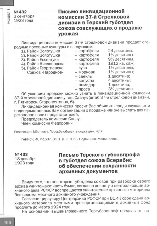 Письмо ликвидационной комиссии 37-й Стрелковой дивизии в Терский губотдел союза совслужащих о продаже урожая. 3 сентября 1923 года // ГАНИСК. Ф. P-1537. Oп. 1. Д. 7. Л. 63. Подлинник. Машинопись.