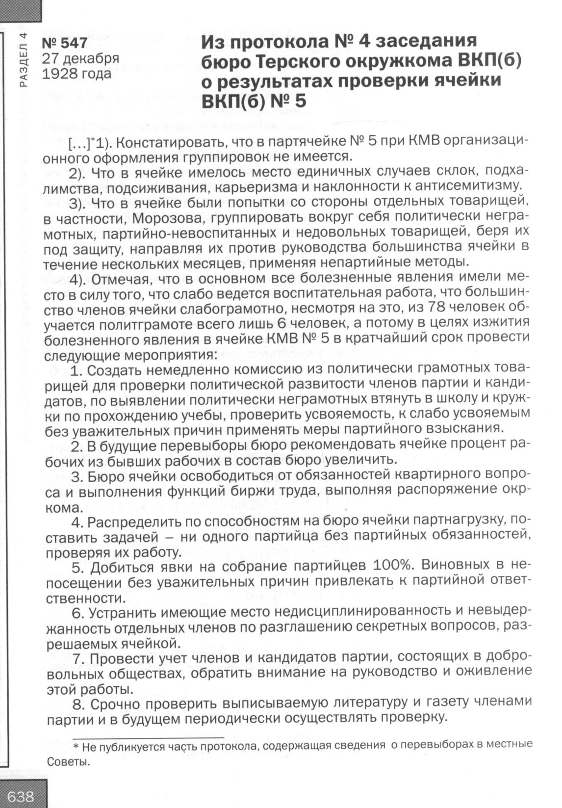 Из протокола № 4 заседания бюро Терского окружкома ВКП(б) о результатах проверки ячейки ВКП(б) № 5. 27 декабря 1928 года // ГАНИСК. Ф. 5938. Oп. 1. Д. 33. Л. 209-209 об. Заверенная копия. Машинопись.