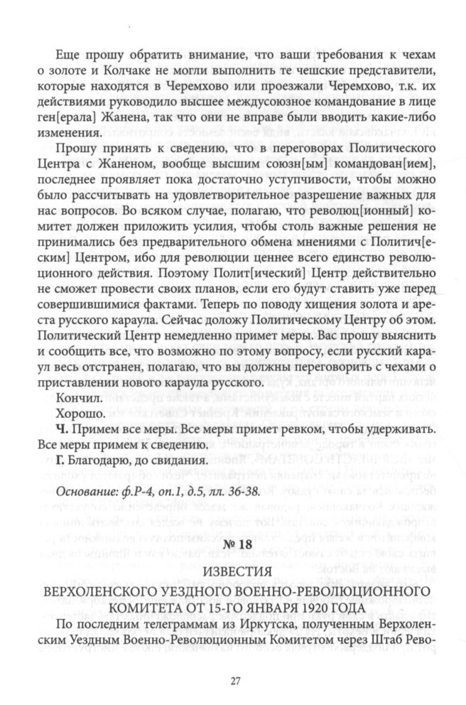 Известия Верхоленского уездного военно-революционного комитета о политической обстановке в крае с 3-го января по 13-е января 1920 г. от 15.01.1920 г. // ГАИО, ф. Р-181, оп. 1. д. 6, лл. 17-18 об.