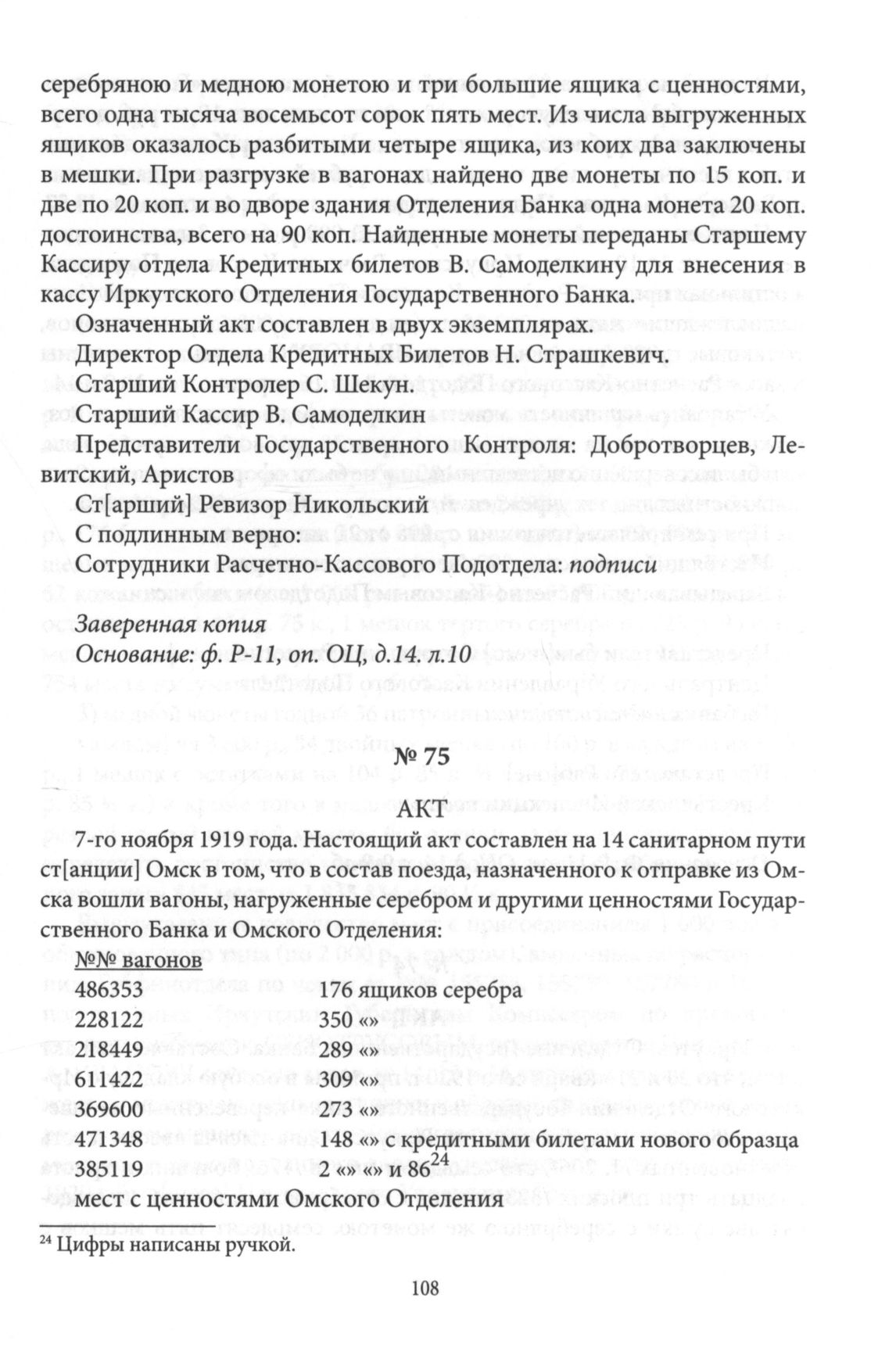 Акт о количестве ящиков с серебром в вагонах поезда, назначенного к отправке из Омска // ГАИО, ф. P-11, оп. ОЦ, д. 14, лл. 11-11 об. Заверенная копия.